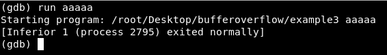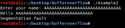 We get “Hello AAAAAAAAAAAAAAAAAAAAAAAAAAAAAA” printed then we don’t see “program exited normally” and we get a segmentation fault error. That happened because we entered 10 extra chars, The program only expected 20 or less. Those extra “AAAAAAAAAA” exceeded the 20 chars buffer and overwrited other data (The print instruction which prints “program exited normally”) which caused a segmentation fault because the program is corrupted.