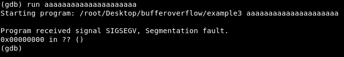 We get a segmentation fault because our return address is overwritten and the program couldn’t continue.