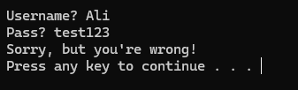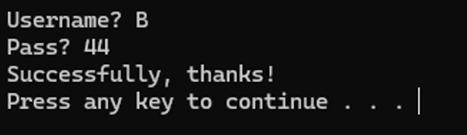 So we got 101100, which in decimal can be presented as 44, so now let's enter any username, his first letter corresponds to ascii letter that is even (for example "B"):