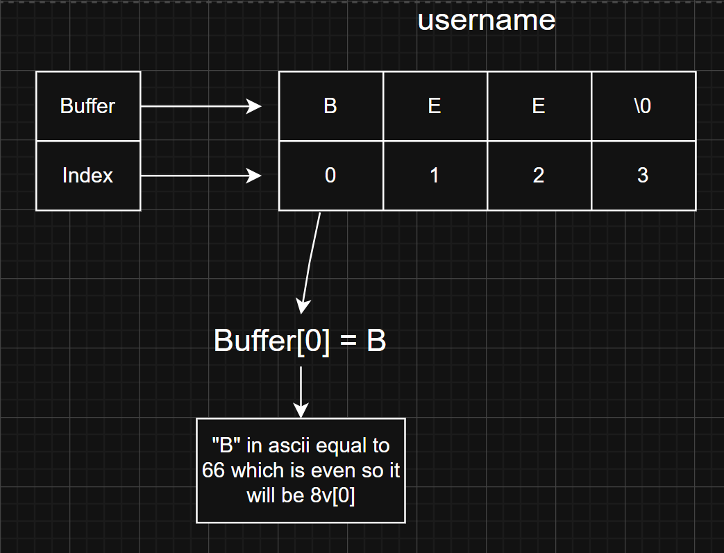 As we know that Buffer variable hold the username of user, so it will take the first index of the username (the first letter represented in ascii) and checks if the ascii value odd or even, so if the value odd then it will be v8[1] because as you know that for example7 % 2 = 1, and if the ascii number is even, it will be v8[0].