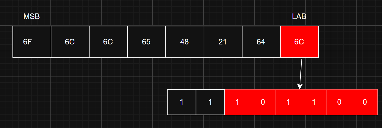 Going back to the if block, only the % 64 left for us to analyze. The % 64 means take only the last 6 bits from the least significant bit. Let's do that, and suppose the user input starts with letter B, which is represented by the number 66, which is even, and even means 8[0], so for now, let's extract the least significant 6 bits: