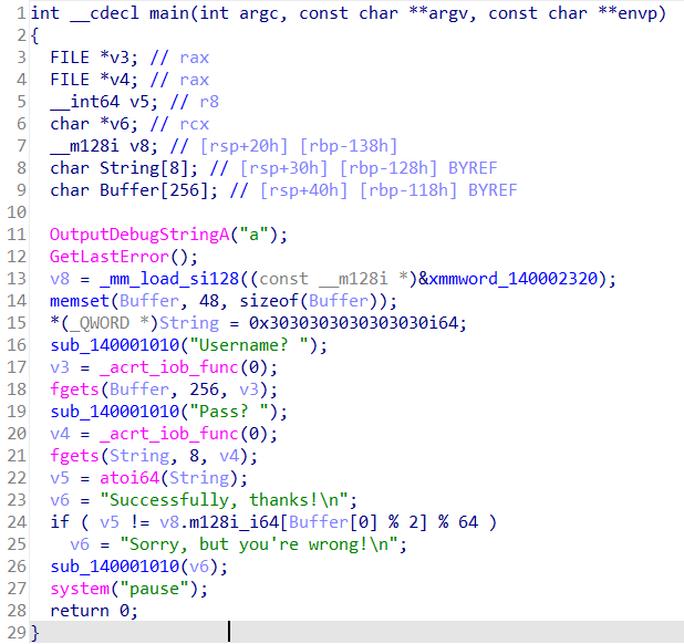 Now let's move to the IDA Pro and decompile the main() function as shown below: