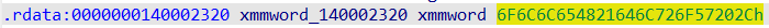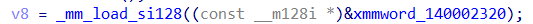 v8hold a value located atxmmword_140002320and that value is6F6C6C654821646C726F57202Chwhich is 128-bit (16-Byte).