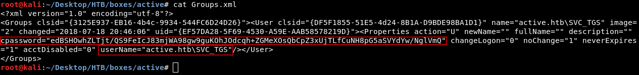 After we access the share we will find a file called Groups.xml in \active.htb\Policies\{31B2F340-016D-11D2-945F-00C04FB984F9}\MACHINE\Preferences\Groups\
