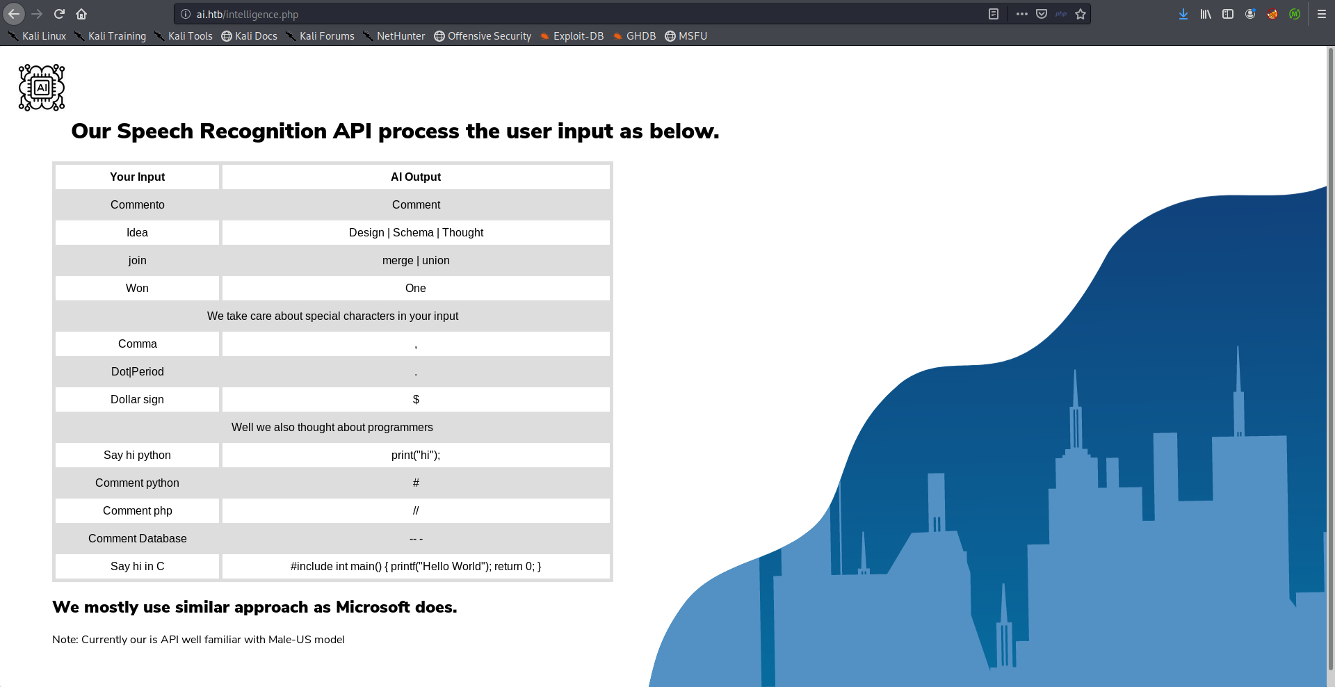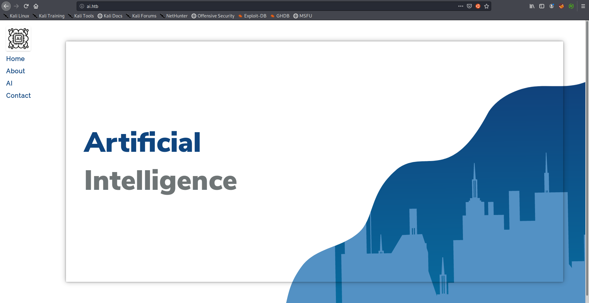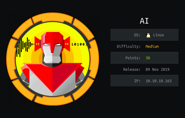 Hey guys, today AI retired and here’s my write-up about it. It’s a medium rated Linux box and its ip is 10.10.10.163, I added it to /etc/hosts as ai.htb. Let’s jump right in !