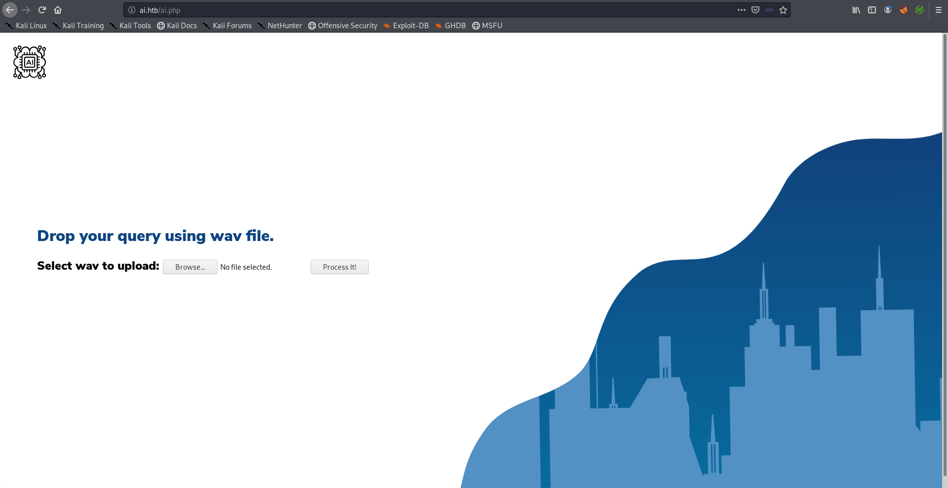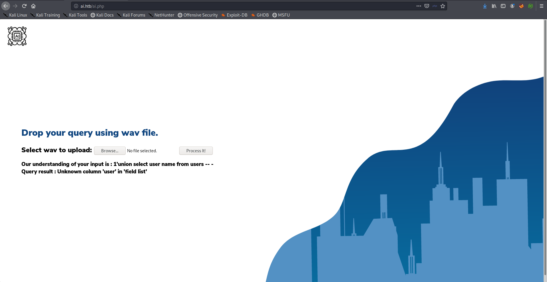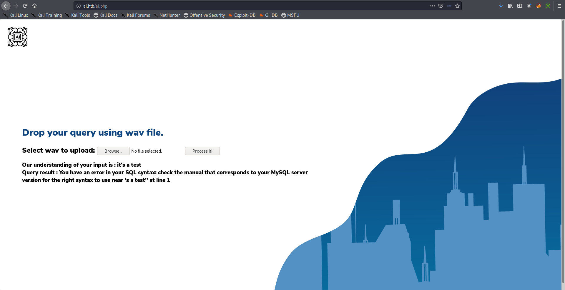 The only interesting page there was /ai.php. From the description (“Drop your query using wav file.”) my first guess was that it’s a speech recognition service that processes users’ input and executes some query based on that processed input, And there’s also a possibility that this query is a SQL query but we’ll get to that later.:
