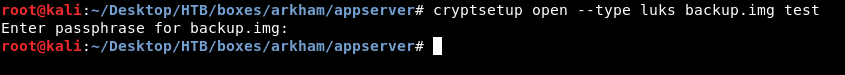 root@kali:~/Desktop/HTB/boxes/arkham/appserver# cryptsetup open --type luks backup.img test