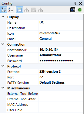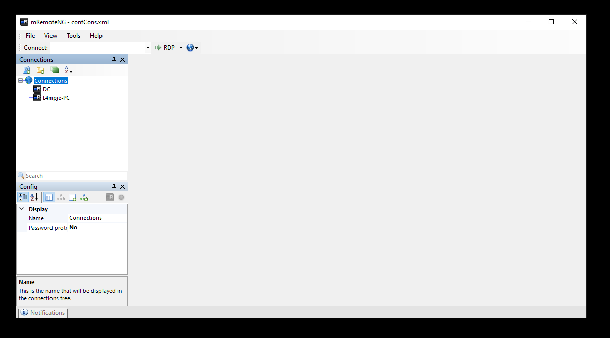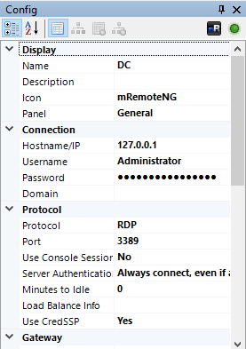 Name="DC" Type="Connection" Descr="" Icon="mRemoteNG" Panel="General" Id="500e7d58-662a-44d4-aff0-3a4f547a3fee" Username="Administrator" Domain="" Password="aEWNFV5uGcjUHF0uS17QTdT9kVqtKCPeoC0Nw5dmaPFjNQ2kt/zO5xDqE4HdVmHAowVRdC7emf7lWWA10dQKiw==" Hostname="127.0.0.1" Protocol="RDP"
