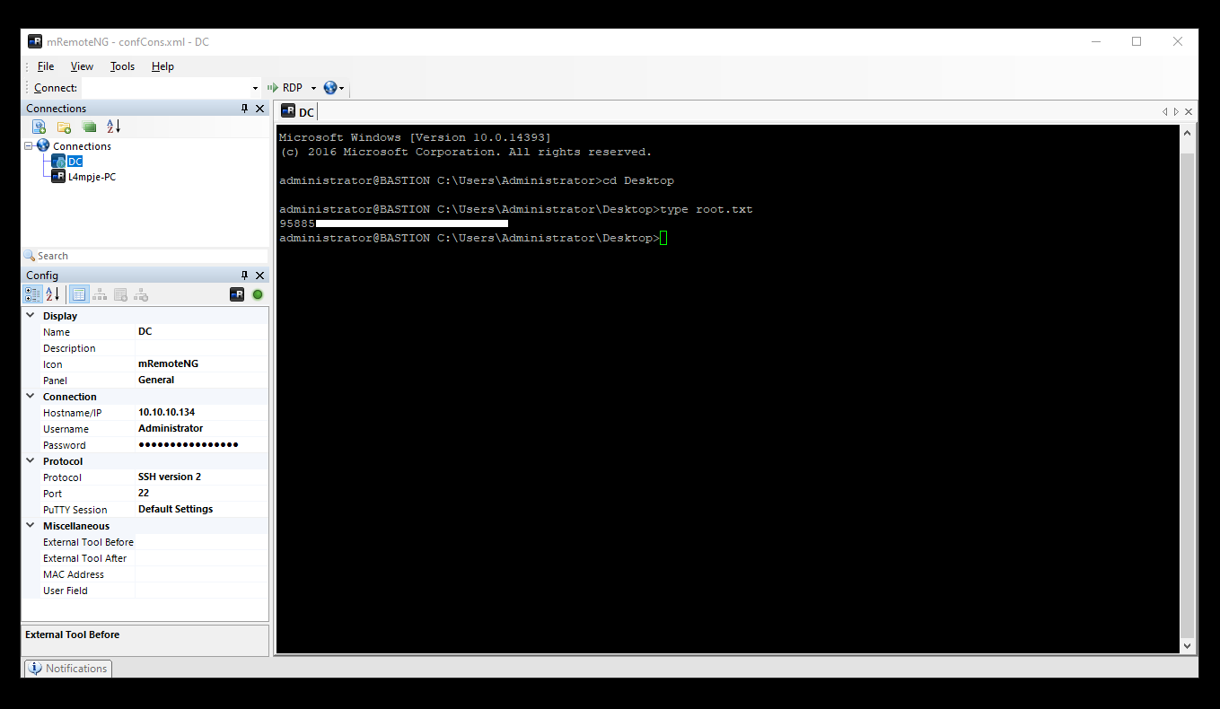 Problem is, as I said in the previous post this password is encrypted, that base-64 encoded string is just for the encrypted password, if you tried to decode it you’ll get nothing readable. We can use the same script I used in the previous post, or since we are on windows we can install mRemoteNG and replace the default confCons.xml file with the one we have, edit the connection’s protocol and make it use ssh instead of RDP then connect to the box.