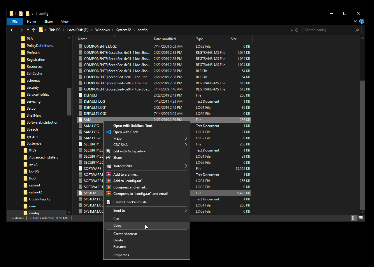 The Users directory had nothing interesting so I started searching in the system files. I could copy SYSTEM and SAM from Windows\System32\config :
