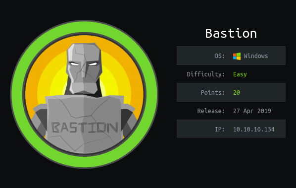 Hey guys today Bastion retired and here’s my write-up about it. It was a nice easy box, unlike most of the other boxes this one had no web service running and unlike most of the Windows boxes it had ssh. I wrote two write-ups for this box, this one solving it with Linux (Kali), Second one solving it with Windows (CommandoVM). It’s a Windows box and its ip is 10.10.10.134, I added it to /etc/hosts as bastion.htb. Let’s jump right in !