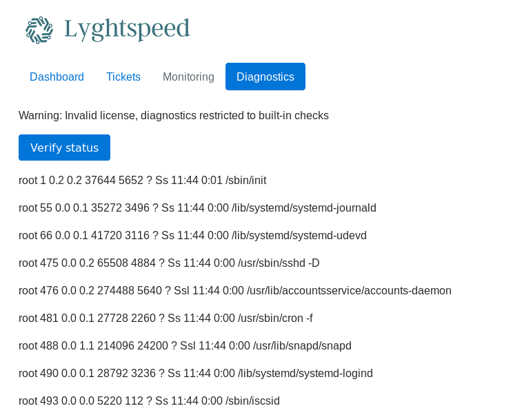 Dashboard , Tickets and Diagnostics are available. But Monitoring is disabled. Tickets are not important now but we will need them later.