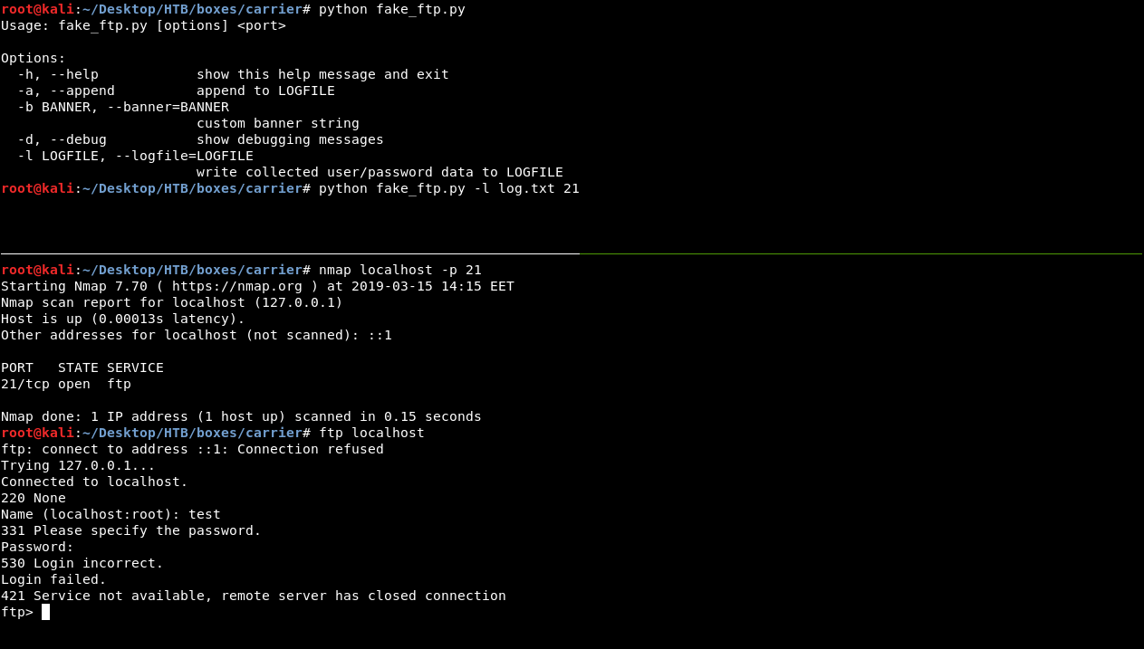 We can fake an FTP server with nc or edit the script to work with python3 , but we will do something different , we will edit iptables rules to route traffic from port 21 on the host to port 21 on our box , so what will finally happen is :