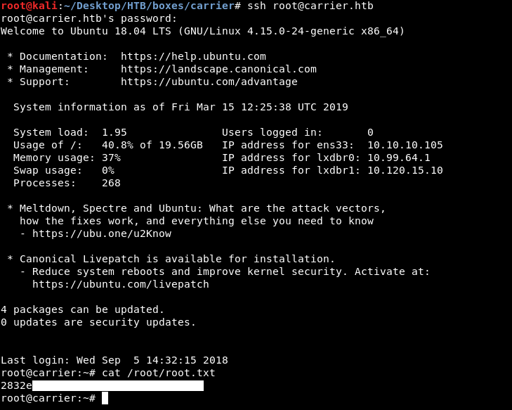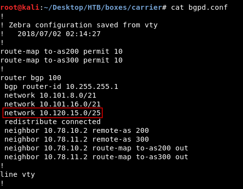 Hey guys today Carrier retired and here is my write-up about it. User on this box wasn’t hard to get , but for root it’s a different thing because we will go through some networking tricks and we will perform an attack called bgp hijacking. The overall experience was great and carrier was one of the best boxes on this platfrom. It’s a linux box and its ip is 10.10.10.105 I added it to /etc/hosts as carrier.htb. Let’s jump right in !