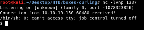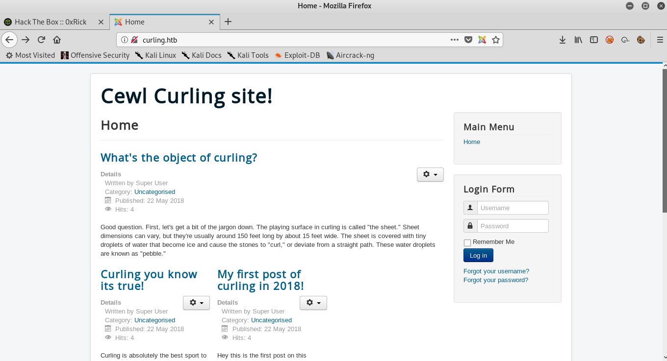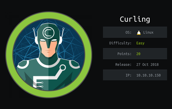 Hey guys today Curling retired and here is my write-up about it. I had a lot of fun doing this box as it was easy and simple. Also it was straightforward , no rabbit holes and such things. It’s a linux box and its ip is 10.10.10.150 I added it to /etc/hosts as curling.htb. Let’s jump right in !