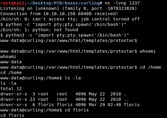 We got a reverse shell as www-data , in the /home directory there’s a directory for floris :