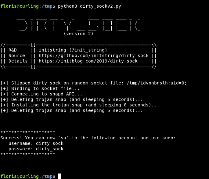 I didn’t like the fact that I could only read the flag , I wanted a root shell. So I tried for a long time to bypass the url thing and get a reverse shell , but couldn’t. Then when I did this box again for the write-up , one of the things that caught my attention is that we are on an ubuntu box , so I checked snap version to know if it’s vulnerable to CVE-2019-7304 known as Dirty Sock and of course it was :