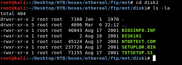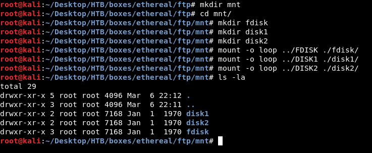 Most likely they are mountable disks so we will create a directory to mount them and call it mnt then we will make a directory for disk1 , disk2 and fdisk and finally we will mount them mount -o loop [Disk] [Directory] :