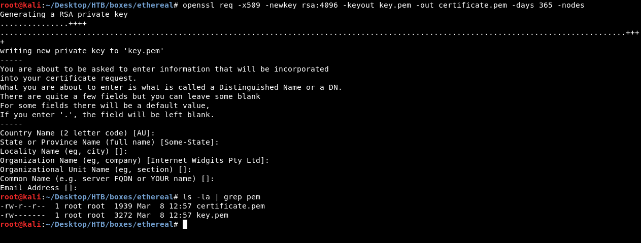 openssl req -x509 -newkey rsa:4096 -keyout key.pem -out certificate.pem -days 365 -nodes
