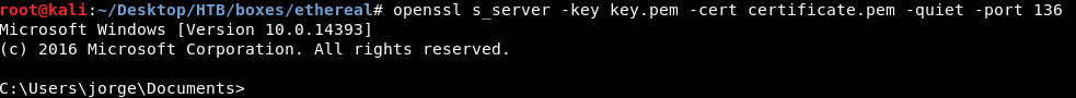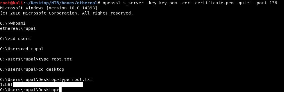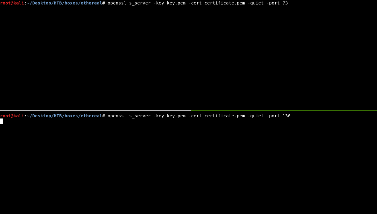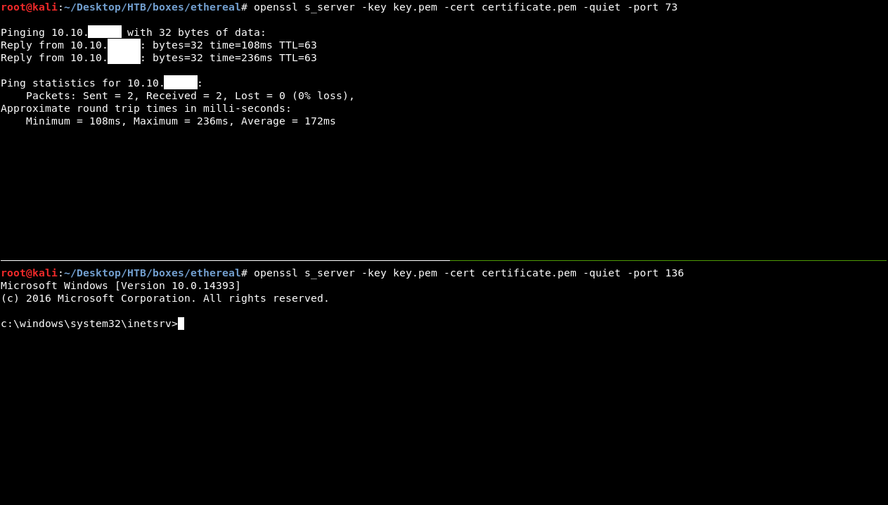We are setting up 2 servers because we are going to use openssl on the box to connect on port 73 and take our input , then we will pipe that input to cmd.exe then we will pipe the output to our server on port 136.