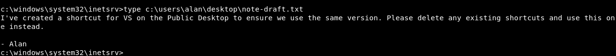 alan’s desktop doesn’t have the flag so we need to escalate to another user , there’s a note on alan’s desktop in a file called note-draft.txt: