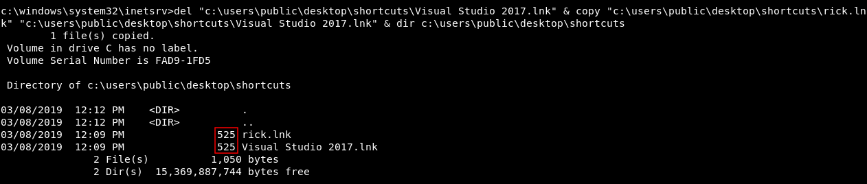 del "c:\users\public\desktop\shortcuts\Visual Studio 2017.lnk" & copy "c:\users\public\desktop\shortcuts\rick.lnk" "c:\users\public\desktop\shortcuts\Visual Studio 2017.lnk" & dir c:\users\public\desktop\shortcuts