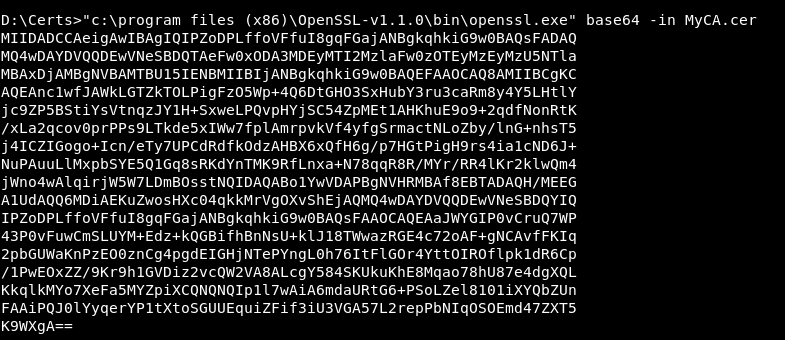 C:\progra~2\OpenSSL-v1.1.0\bin\openssl.exe base64 -in MyCA.cer