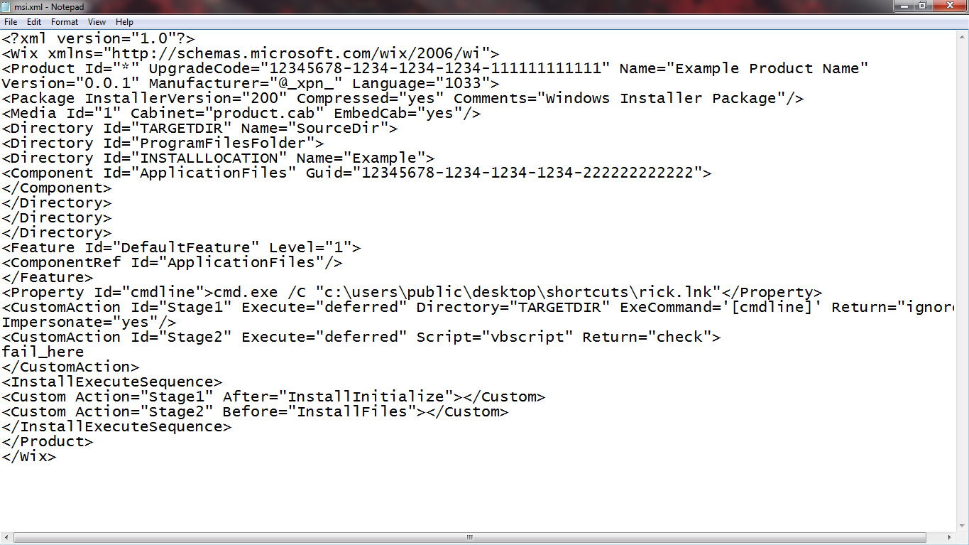 <Product Id="*" UpgradeCode="12345678-1234-1234-1234-111111111111" Name="Example Product Name"