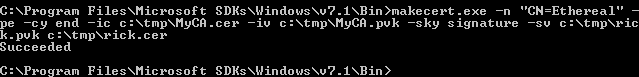 makecert.exe -n "CN=Ethereal" -pe -cy end -ic c:\tmp\MyCA.cer -iv c:\tmp\MyCA.pvk -sky signature -sv c:\tmp\rick.pvk c:\tmp\rick.cer