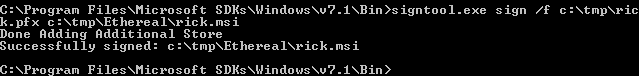 signtool.exe sign /f c:\tmp\rick.pfx c:\tmp\ethereal\rick.msi