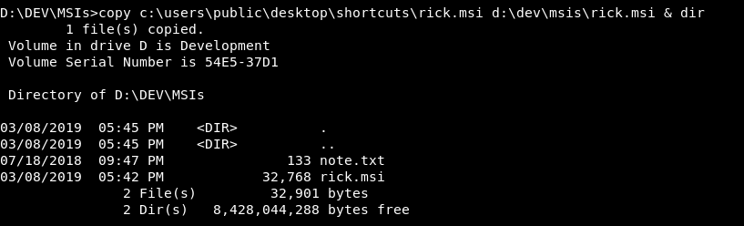 Now back to our kali we will upload the msi the same way we uploaded the lnk file before , and we also need to make sure that the lnk file is in c:\users\public\desktop\shortcuts\ because the msi is just executing that lnk. We will put the msi into D:\DEV\MSIs