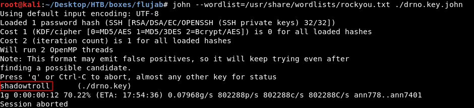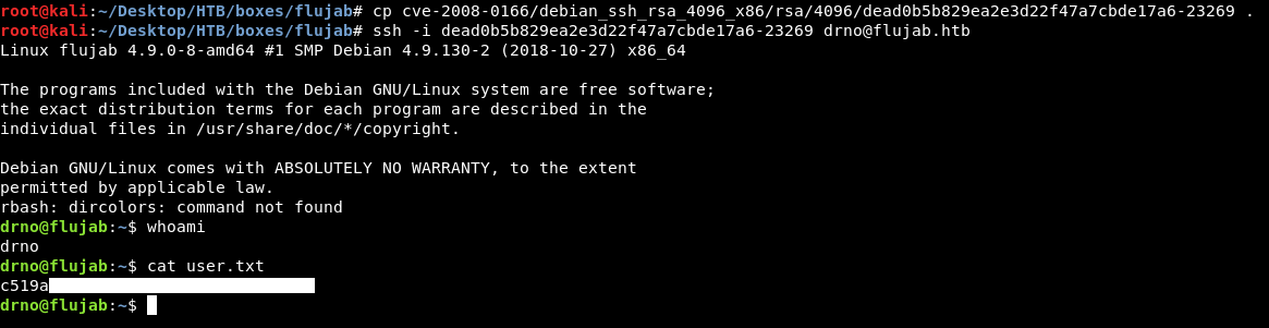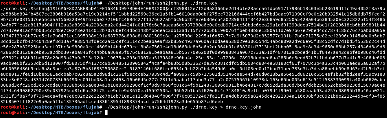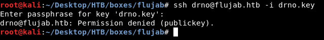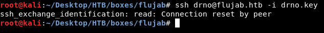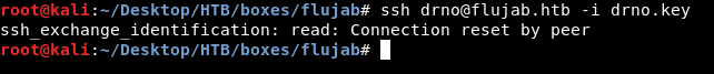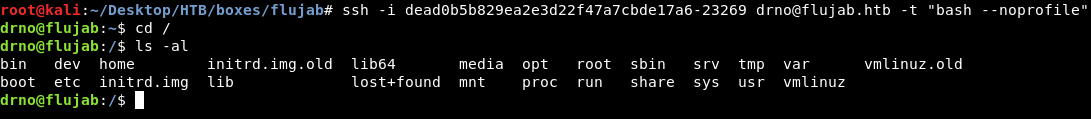 ssh -i dead0b5b829ea2e3d22f47a7cbde17a6-23269 drno@flujab.htb -t "bash --noprofile"