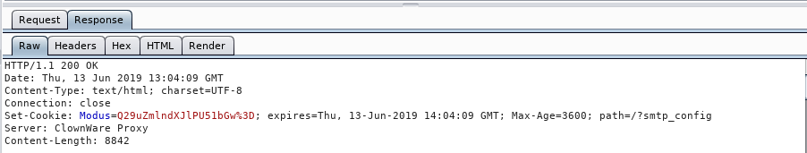 I checked the requests and the responses of different pages and actions. I noticed in one of the responses a Set-Cookie header that sets a cookie called Modus and sets the path for it to /?smtp_config.