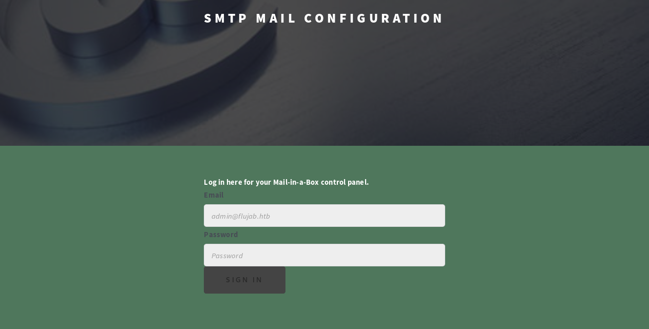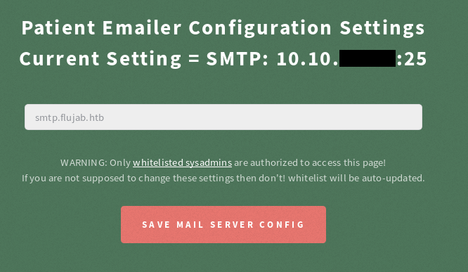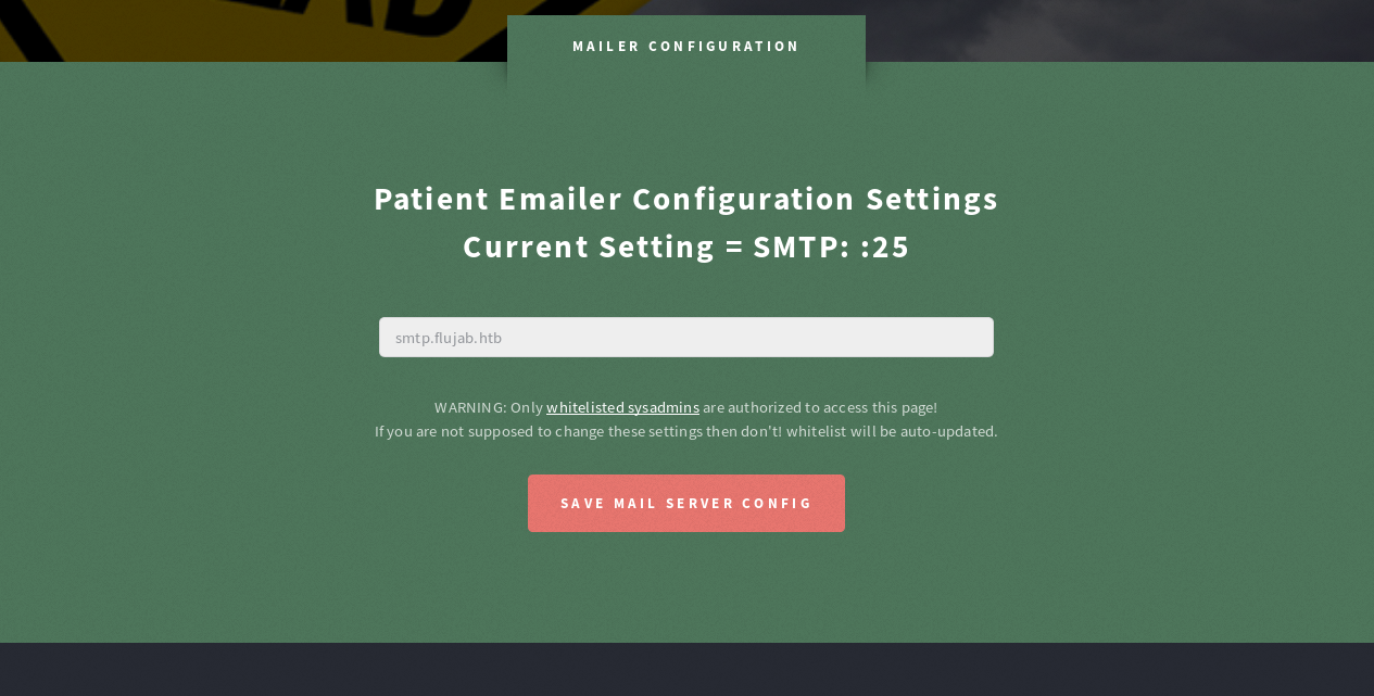 <input type="text" name="mailserver" id="email-server" value="smtp.flujab.htb" pattern="smtp.[A-Za-z]{1,255}.[A-Za-z]{2,5}" title=" A Valid SMTP Domain Address Is Required"/>