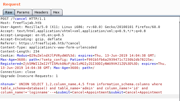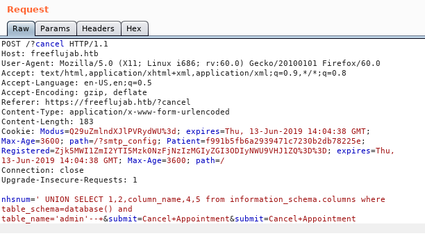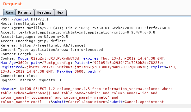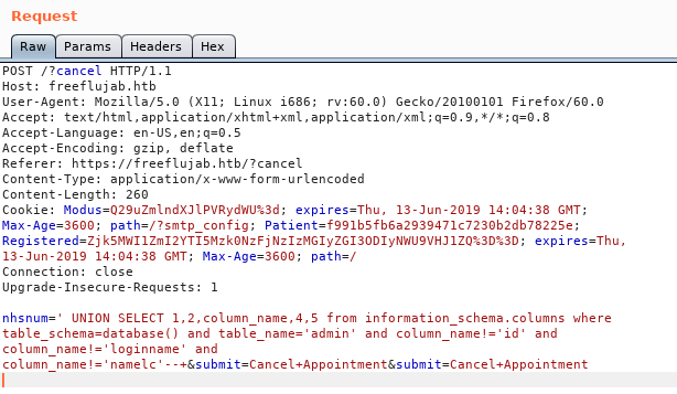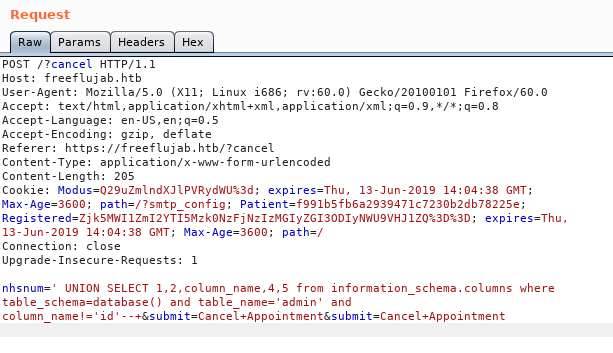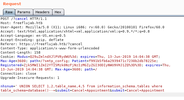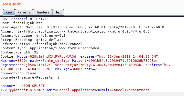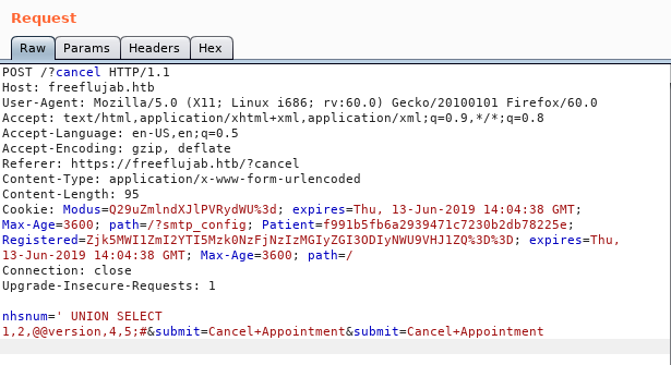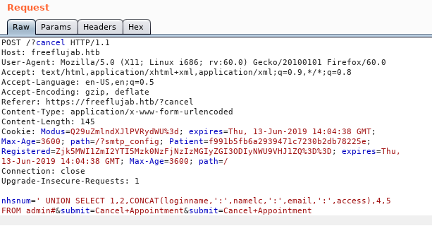 The response was a redirection to /?denied. We are sending 3 cookies in every request : Modus , Patient and Registered. Modus and Registered are base-64 encoded strings while Patient is an md5 hash.
