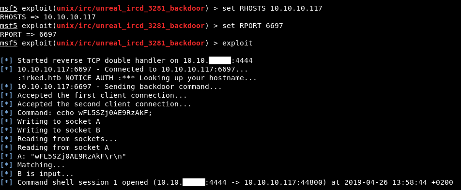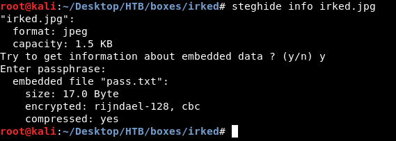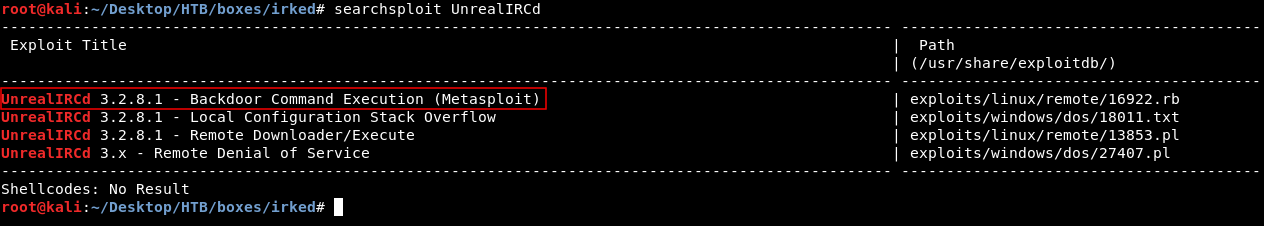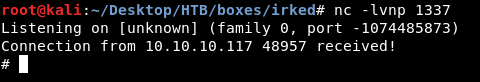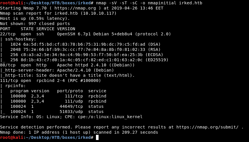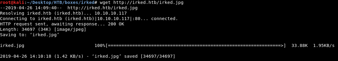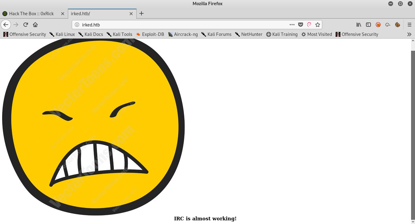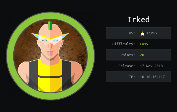 Hey guys, today Irked retired and here’s my write-up about it. It was an easy straightforward machine, no rabbit holes and such things. To get an initial shell on the box we will exploit an RCE vulnerable irc server called UnrealIRCd. After getting a shell we will find a backup file which has a password. We will use that password to get a hidden text file from an image (steg). That text file contains another password which we will use to get ssh access as another user. Finally for privilege escalation there is an suid binary that executes a file, and we control that file so we can get a reverse shell as root. It’s a linux box and its ip is 10.10.10.117. I added it to /etc/hosts as irked.htb. Let’s jump right in !