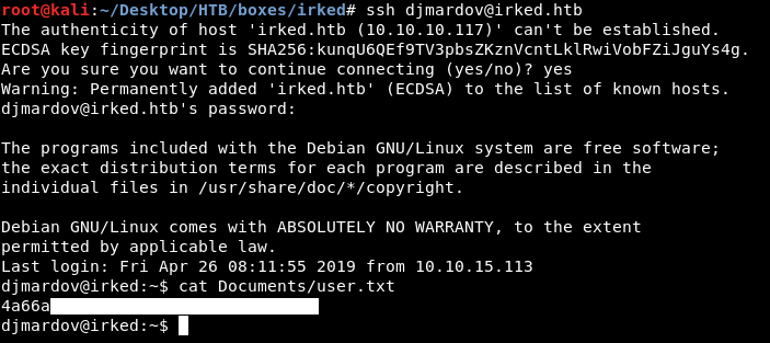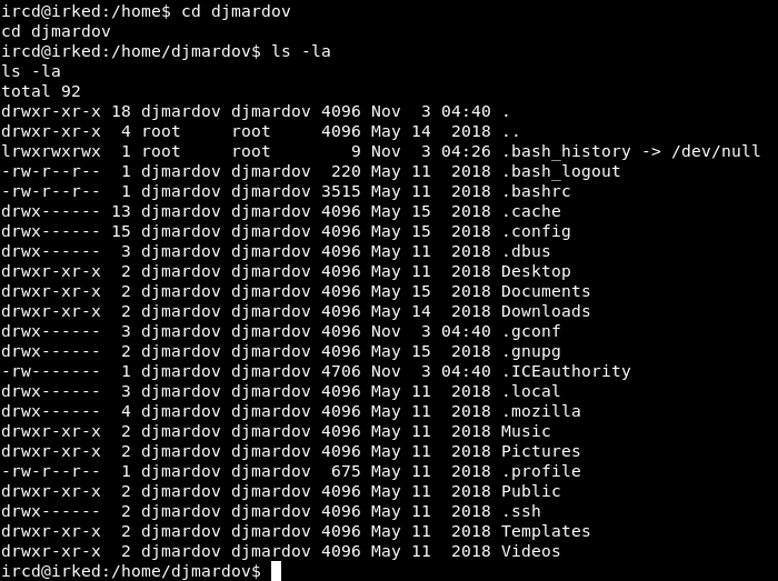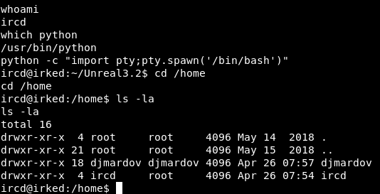 There are two users on the box : ircd and djmardov. I checked /home/ircd and there was nothing interesting. In /home/djmardov I didn’t find user.txt :
