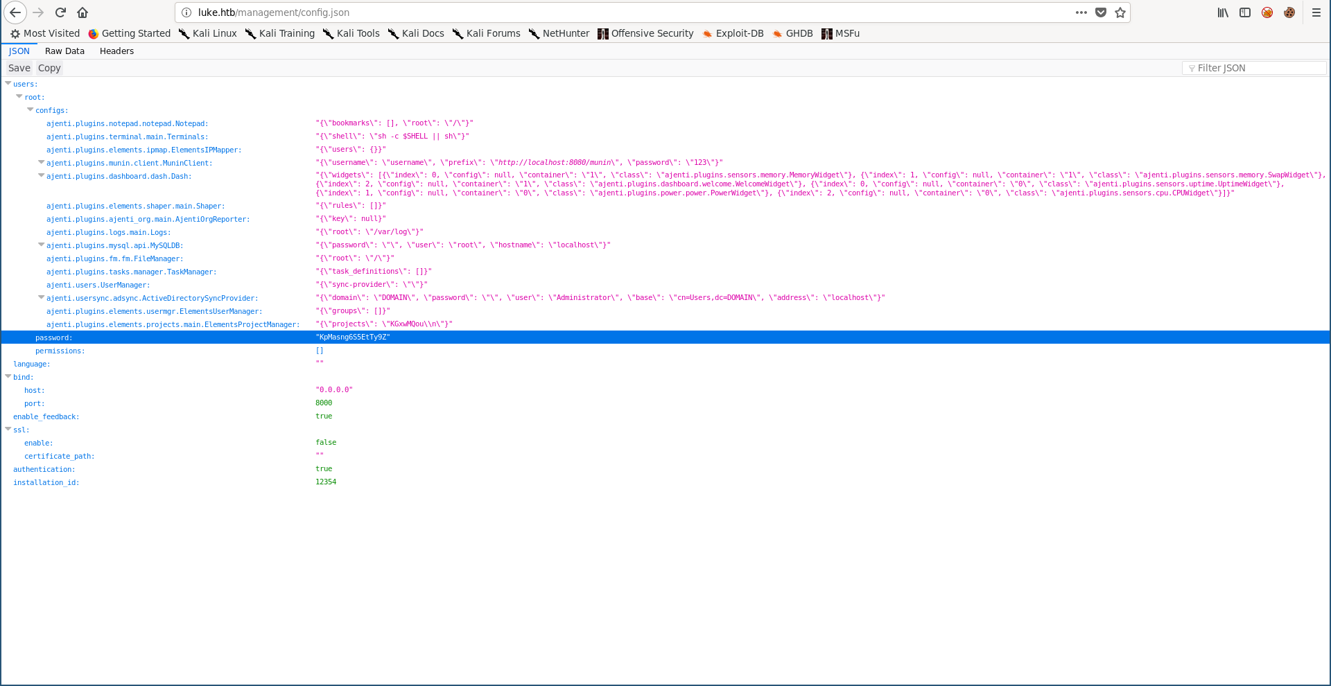 root@kali:~/Desktop/HTB/boxes/luke# curl -X GET -H 'Authorization: Bearer eyJhbGciOiJIUzI1NiIsInR5cCI6IkpXVCJ9.eyJ1c2VybmFtZSI6ImFkbWluIiwiaWF0IjoxNTY4MzczNjA0LCJleHAiOjE1Njg0NjAwMDR9.Xt854IyFtvP4nQbQa_l63hIJ3aewfVT98gqz5gfU5Us' http://luke.htb:3000/