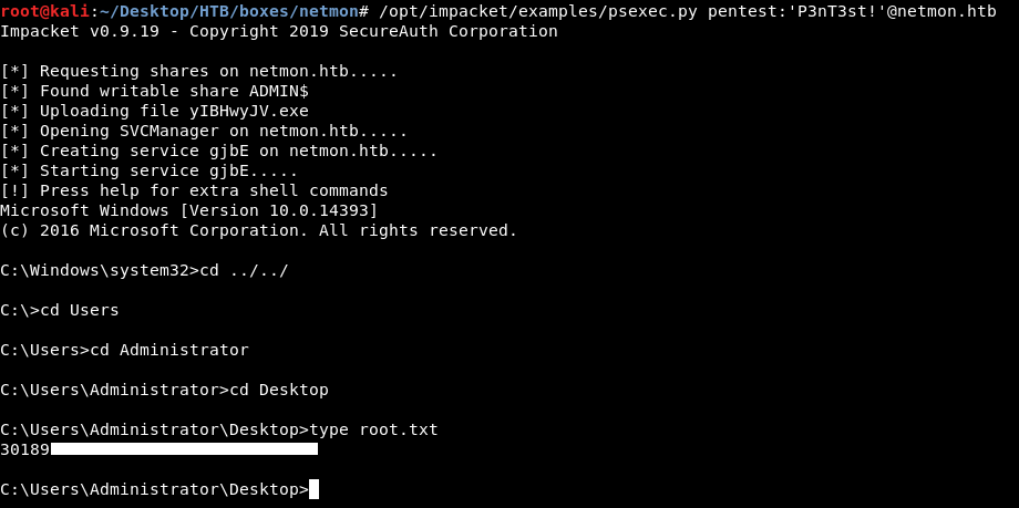 psexec.py pentest:'P3nT3st!'@netmon.htb