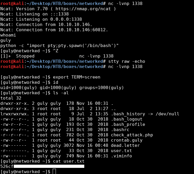 root@kali:~/Desktop/HTB/boxes/networked# nc -lvnp 1338