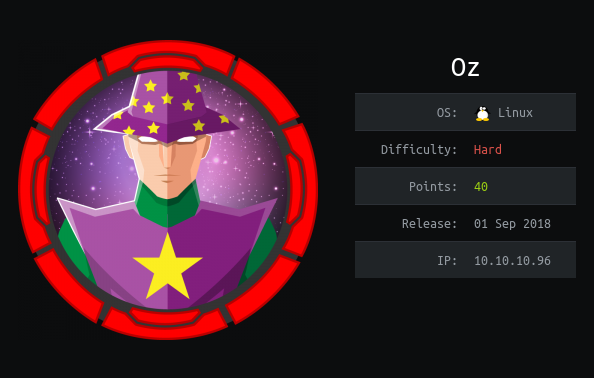 Hey I’m back with another Hack The Box write-up , this time Oz has retired and it was rated as a hard box. I enjoyed this box , it was really fun. It had some docker tricks which were very cool , It’s a linux box and it’s ip is 10.10.10.96 so let’s jump right in.