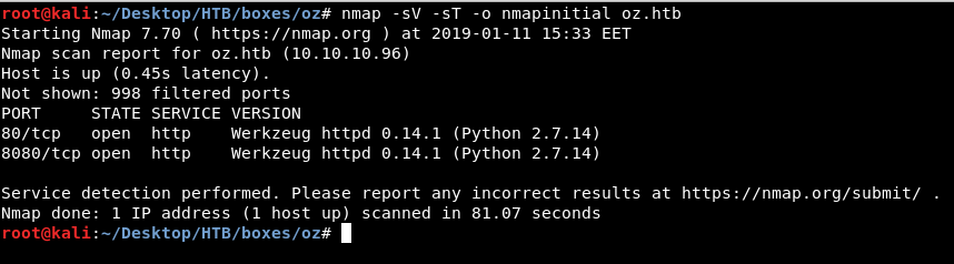 nmap -sV -sT -o nmapinitial oz.htb