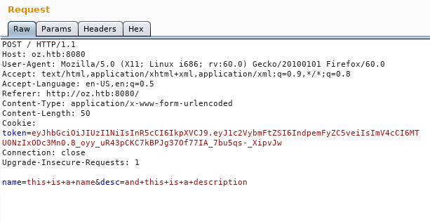 By capturing that request in burp we will see a POST request with two parameters name and desc.